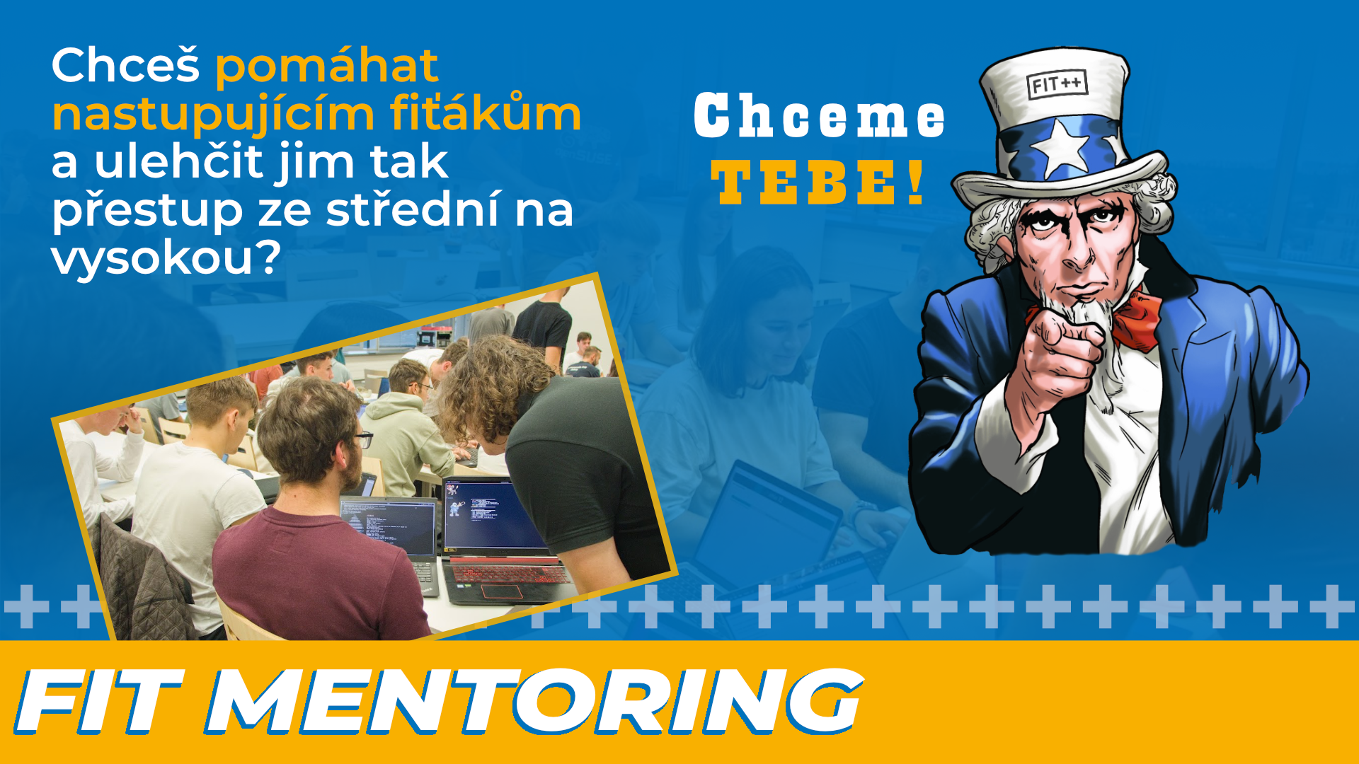Určitě si pamatuješ, že začátek studia na FITu přinesl hodně otázek, obav a nejasností. Proto od září spouštíme program FIT Mentoring, ve kterém se studenti budou moct obracet na zaběhlejší studenty s jakýmikoliv dotazy. Chceš pomáhat nastupujícím fiťákům a ulehčit jim tak přestup ze střední na vysokou? Máš nějaký tip jak zvládnout DML, PA1 nebo jenom trik jak to všechno stihnout a nevyhořet? Právě tebe hledáme!
